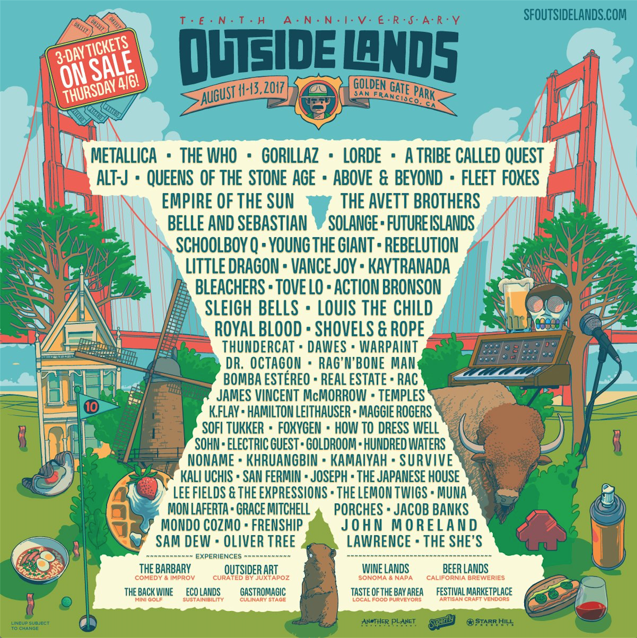 The tenth anniversary edition of Outside Lands is delivering some heavy hitters to headline with locals Metallica performing for their second time, The Who and a rare appearance by Gorillaz. Lorde, A Tribe Called Quest, Queens of the Stone Age, alt-J, The Avett Brothers, Solange and a slew of other artists will perform the festival at Golden Gate Park August 11-13, 2017. Tickets go on sale Thursday April 6, 2017 at 10am/PT. Check out the entire lineup!