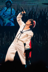 He seamlessly transitioned into “Never Ending Song” from his 2024 album Found Heaven, climbing atop an old-school windmill, waving and singing to every corner of the arena. During “Care,” he made his way down the wishbone-shaped catwalk, sending fans into a frenzy as he got closer and closer.