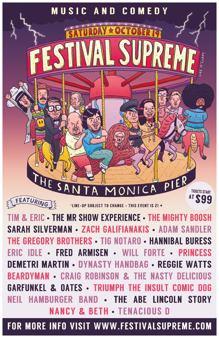 Tenacious D, the Greatest Band in the World, has announced it has curated Festival Supreme, a one-day comedy and music festival set to take place on Saturday, October 19 on the Santa Monica Pier in Santa Monica, CA. The lineup includes Adam Sandler, Sarah Silverman, Zach Galifianakis, Demetri Martin and of course, Tenacious D as amongst 25 of the best comedians around today. Tenacious D, aka, Jack Black and Kyle Gass stated, “We’ve been trying to put this thing together for years. The comedy + music event of the century. Festival Supreme! It will shake the heavens and bring this town to its knees…in a good way.”
